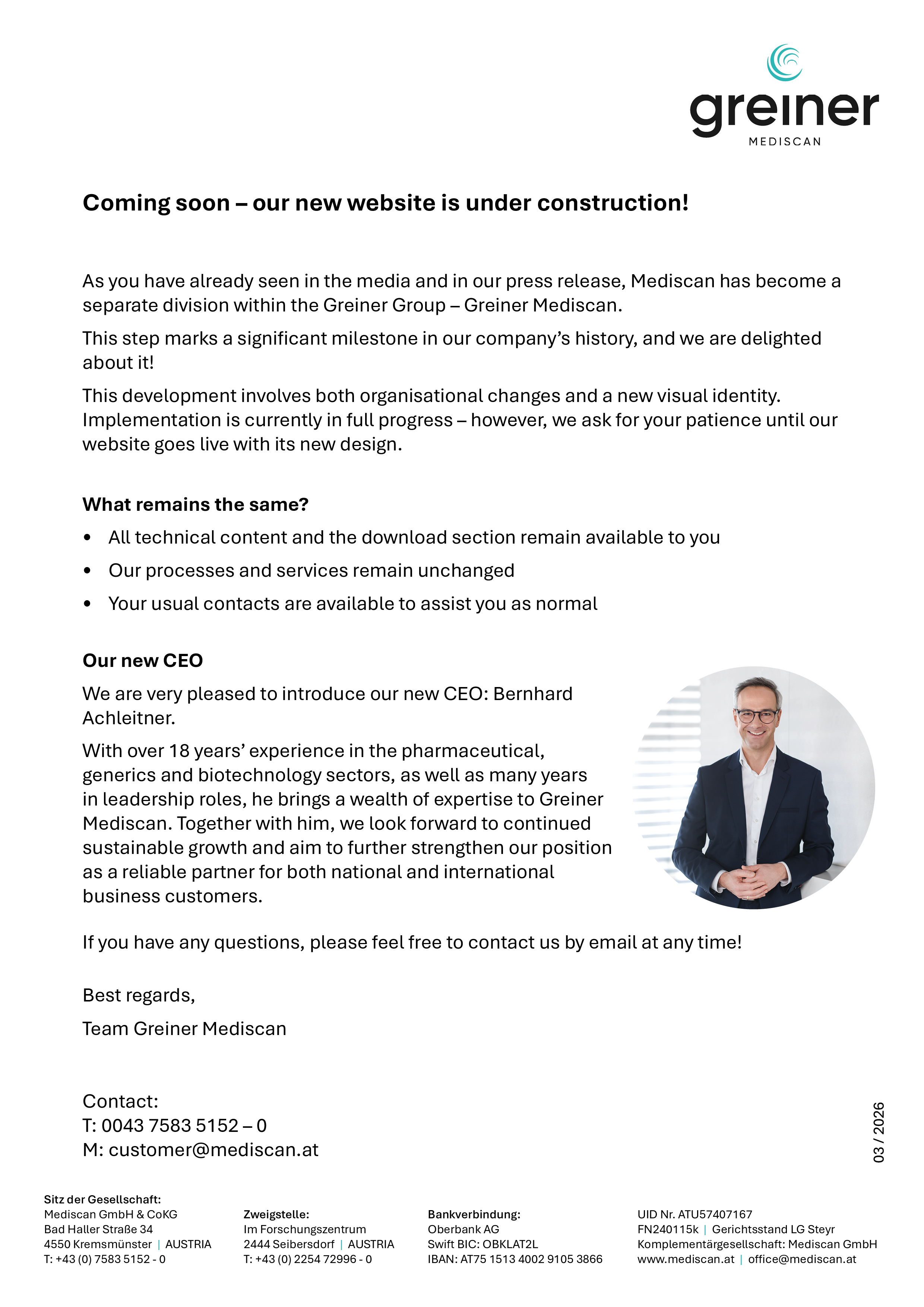 Mediscan is certified according to EN ISO 13485 and EN ISO 11137-1 and authorized to sterilize pharmaceuticals at both sites.